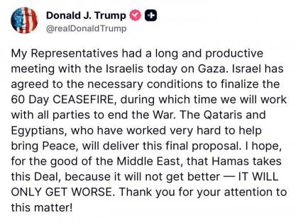 अमेरिकेचे राष्ट्रपती डोनाल्ड ट्रम्प यांनी म्हटलं की, माझ्या प्रतिनिधींनी आज गाझा इस्त्रायल मुद्द्यावर इस्त्रायली नेत्यांसोबत चर्चा केली. दीर्घवेळ चाललेल्या या बैठकीत इस्त्रायलने ६० दिवस गाझामध्ये युद्धविराम करण्यास अटींसह सहमती दर्शवली आहे. याकाळात हे युद्ध संपवण्यासाठी आम्ही दोन्ही बाजूंना एकत्र आणून काम करू. कतार आणि मिस्त्र नेत्यांनी ही शांतता आणण्यासाठी खूप मेहनत घेतली. ते अंतिम प्रस्ताव सादर करतील. मला खात्री आहे, मध्य पूर्वेतील देशांच्या हितासाठी हमास या तडजोडीचा स्वीकार करेल. कारण त्यांनी जर हे स्वीकारले नाही तर ते योग्य ठरणार नाही. तिथली परिस्थिती आणखी बिघडू शकते असं त्यांनी म्हटलं.