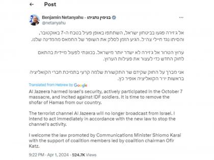 ערוץ הטרור אל ג׳זירה לא ישדר יותר מישראל. בכוונתי לפעול מיידית בהתאם לחוק החדש כדי לעצור את פעילות הערוץ.