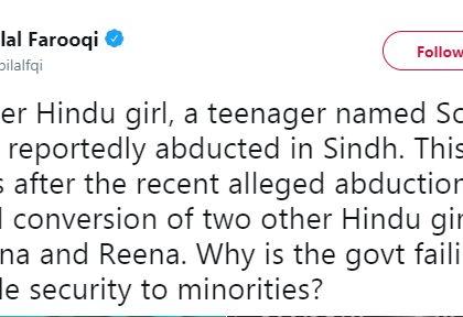 बिलाल फारुकी यांनी ट्विटमध्ये लिहलं आहे की, आणखी एक हिंदू मुलीचं सिंध प्रांतातून अपहरण करण्यात आलेलं आहे. ही घटना तेव्हा घडली आहे जेव्हा पाकिस्तानात दोन अल्पवयीन हिंदू मुलींचे अपहरण करण्याचा घटना सर्व माध्यमांमध्ये चर्चेत आहे