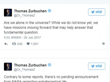 ""परग्रहवासीयांविषयी घोषणा करण्यासारखं नासाकडे सध्यातरी काही नाही...मीडियामध्ये आलेलं वृत्त चुकीचं आहे.... ब्रम्हांडात आपण एकटेच आहोत का? हे आम्हालाही अजून नक्की माहिती नाही ... पण या महत्त्वाच्या प्रश्नाचं उत्तर शोधण्यासाठी आमचे अनेक मिशन सुरू आहेत"", असं ट्विट करून एलियन्सच्या अस्तित्वाबाबत नासा सध्यातरी कोणताही खुलासा करणार नसल्याचं झुर्बिचेन यांनी स्पष्ट केलं आहे.