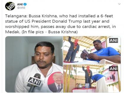 अमेरिकेचे राष्ट्राध्यक्ष कोरोनातून बरे व्हावे म्हणून उपोषण करणारा तेलंगणातील शेतकरी बुसा क्रिष्णा राजू याचं कार्डियाक अरेस्टने निधन झाल्याची बातमी समोर आली आहे. ट्रम्प कोरोना पॉझिटिव्ह आल्यानंतर राजूने गेल्या काही दिवसांपासून अन्नत्याग केला होता, अनेक दिवस तो झोपला नव्हता. सतत ट्रम्प बरे व्हावे ही प्रार्थना तो करता होता. पण त्याचा यादरम्यान जीव गेला.