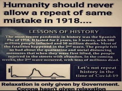देशातील कोरोनाबाधितांची संख्या दिवसागणिक वाढत आहे. भारत सर्वाधिक कोरोना रुग्णांच्या यादीत सहाव्या क्रमांकावर पोहोचला आहे. गेल्या काही दिवसांत संपूर्ण जगात कोरोना रुग्णांची संख्या झपाट्यानं वाढली आहे. बऱ्याचशा देशांनी लॉकडाऊन हटवल्यानं कोरोना रुग्णांची संख्या वाढल्याचा दावा केला जात आहे. याचाच संदर्भ देत 'माणसानं १९१८ मध्ये केलेल्या चुकीची पुनरावृत्ती करू नये', अशी एक फेसबुक पोस्ट सध्या व्हायरल झाली आहे. हजारो जणांनी ती शेअर केली आहे.