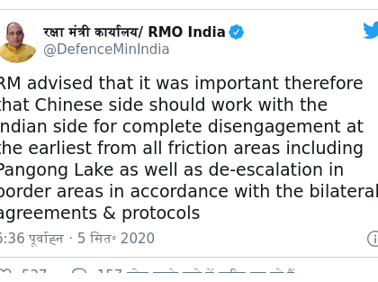 — रक्षा मंत्री कार्यालय/ RMO India (@DefenceMinIndia) September 4, 2020