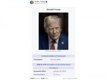 Donald Trump Acting President of Venezuela: अमेरिकेचे अध्यक्ष डोनाल्ड ट्रम्प यांनी त्यांच्या सोशल मीडिया प्लॅटफॉर्म, ट्रुथ सोशलवर एक पोस्ट शेअर करून आंतरराष्ट्रीय जगतात खळबळ उडवून दिली आहे. ट्रम्पच्या अधिकृत फोटोसह पोस्टमध्ये असे म्हटले आहे की ते सध्या व्हेनेझुएलाचे 'कार्यवाहक राष्ट्राध्यक्ष' आहेत. ट्रम्प यांनी अमेरिकेची निवडणूक जिंकून २० जानेवारी २०२५ ला दुसऱ्यांदा राष्ट्राध्यक्षपदाचा पदभार स्वीकारला. ते अमेरिकेचे ४७वे राष्ट्राध्यक्ष आहेत. तशातच आता त्यांनी अमेरिकेने कब्जा केलेल्या व्हेनेझुएलाचे कार्यवाहक राष्ट्राध्यक्ष म्हणून स्वत:ला घोषित केले आहे.