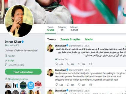 पाकिस्तानमधील निवडणुकांमध्ये इम्रान खान यांच्या पक्षाचा विजय झाल्यानंतर इम्रान हेच भावी पंतप्रधान बनतील, असा निष्कर्ष निघला आहे. तर, इम्रान यांचे पंतप्रधानपद भारताला धोक्याचे असल्याचेही अनेकांनी म्हटले. मात्र, क्रिकेटच्या माध्यमातून भारताशी सौहार्दाचे संबंध इम्रान यांचे बनल्याचेही काही क्रीडा समिक्षकांनी सांगितले. मात्र, एकंदरीतच इम्रान यांच्या ट्विटर अकाऊंटचा अभ्यास केल्यास त्यांच्या फॉलोईंग लिस्टमध्ये एकाही भारतीयाचा समावेश नाही. इम्रान यांनी त्यांच्या ट्विटर अकाऊंटवरुन आतापर्यंत 5568 ट्विट्स केले आहेत. त्यातील शेवटचे ट्विट हे 25 जुलै करण्यात आले असून क्वेटा येथे झालेल्या दहशतवादी हल्ल्याचा निषेध या ट्विटमधून नोंदविण्यात आला आहे.