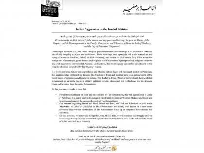 पहलगाम दहशतवादी हल्ल्यानंतर भारताने ऑपरेशन सिंदूर हाती घेत पाकिस्तानातील ९ दहशतवादी तळांवर हल्ला केला. या हल्ल्यात १०० हून अधिक दहशतवादी मारले आहेत. त्यानंतर अल कायदाच्या भारतीय उपमहाद्विप शाखेकडून निवेदन जारी करण्यात आले आहे. पाकिस्तानवर झालेल्या हल्ल्याला यातून उत्तर दिले आहे. हे विधान अस-सहाब-मीडियाच्या माध्यमातून केले. अल कायदा संघटनेने भारताला धमकी देत या हल्ल्याचा बदला घेऊ असं म्हटलं आहे.