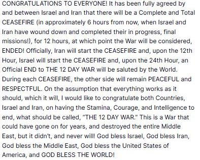 डोनाल्ड ट्रम्प यांनी ट्रूथ या समाजमाध्यमावर युद्धविरामाबाबत माहिती देताना लिहिले की, जेव्हा सर्व पक्ष आपापल्या मोहिमा पूर्ण करतील, तेव्हा युद्धविरामास सुरुवात होईल. तसेच पुढच्या १२ तासांनंतर दोन्ही देश शांत राहतील. २४ तासांनंतर हे युद्ध संपले असं समजण्यात येईल. विश्लेषकांच्या मते हा एक ऑपरेशनल ब्रेक होता. म्हणजेच दोन्ही देशांना आपल्या अंतिम लष्करी मोहिमा पूर्ण करण्यासाठी एक मार्ग देण्यात आला आहे. ज्यामुळे त्यांना सन्माननीय मार्गाने युद्धविराम लागू करता येईल.