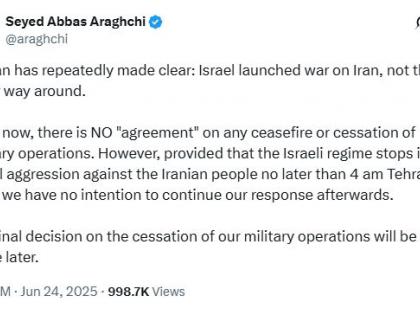 इस्राइलने ऑपरेशन रायझिंग लायन अंतर्गत इराणमधील अणुकेंद्रांना लक्ष्य केल्यानंतर इराण आणि इस्राइलमध्ये मागच्या १२ दिवसांपासून भीषण संघर्ष सुरू होता. यादरम्यान, दोन्ही देशांकडून एकमेकांवर करण्यात आलेल्या क्षेपणास्त्र हल्ल्यांमध्ये दोन्हीकडे मोठ्या प्रमाणावर जीवित आणि वित्तहानी झाली. अखेरीस भारतीय वेळेनुसार आज पहाटे अमेरिकेचे राष्ट्राध्यक्ष डोनाल्ड ट्रम्प यांनी दोन्ही देशांमध्ये युद्धविराम झाल्याची घोषणा केल्याने गेल्या १२ दिवसांपासून इस्राइल आणि इराण यांच्यात सुरू असलेला संघर्ष आता थांबेल, असी अपेक्षा व्यक्त केली जात आहे. त्याच पार्श्वभूमीवर इराणच्या परराष्ट्र मंत्र्यांनी आपल्या देशाची भूमिका स्पष्ट केली आहे.