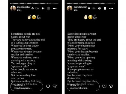 मंदानाचं दुःख तिच्या चेहऱ्यावर स्पष्टपणे जाणवत आहे. तिने व्हिडिओसोबत कॅप्शनमध्ये लिहिलं आहे की, "खूप जास्त वेदना होत आहेत, पण खूप मोठी आशा देखील आहे. कदाचित आता 'नौरोज़' (इराणी नवीन वर्ष) वेगळं असेल. इराणसाठी प्रार्थना करा."