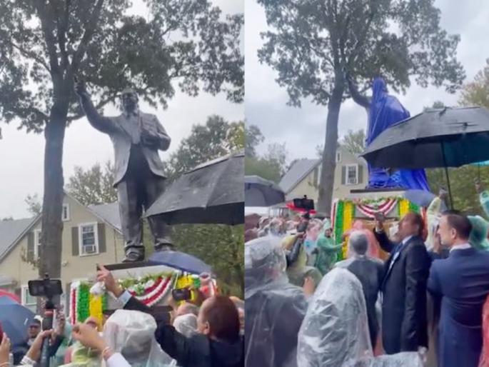 वॉशिंग्टन - भारतरत्न आणि संविधान निर्माते ड़ॉ. बाबासाहेब आंबेडकर यांचा अमेरिकेतील वॉशिंग्टन येथे पूर्णाकृती पुतळा उभारण्यात आला आहे. स्टॅच्यू ऑफ इक्वॉलिटी या नावाने १९ फूट उंच पुतळ्याचे अनावरण करण्यात आले. भारत आणि अमेरिकन नागरिकांसाठी हा अभिमानाचा क्षण असल्याचं यावेळी, उपस्थितांनी म्हटलं. विशेष म्हणजे भरपावसात पुतळा अनावरणासाठी नागरिकांनी एकत्र येत डॉ. बाबासाहेबांना अभिवादन केलं. यासाठी अमेरिकेच्या विविध भागांतून ५०० हून अधिक भारतीय व अमेरिकन नागरिक उपस्थित होते. यावेळी जय भीमचा जयघोषही करण्यात आला.
