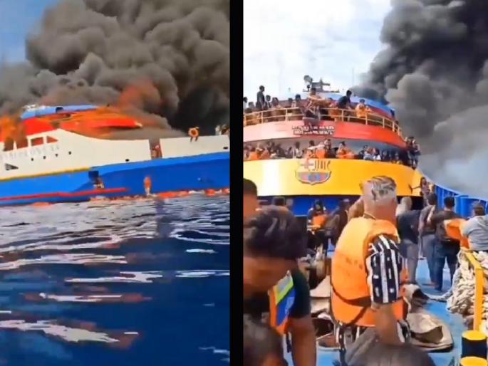 इंडोनेशियामध्ये एक मोठी दुर्घटना घडली आहे. एका प्रवासी जहाजाला भीषण आग लागल्यानंतर प्रवाशांनी जहाजावरून उड्या मारल्या. उत्तर सुलावेसीमधील तालिस बेटाजवळ केएम बार्सिलोना व्हीए जहाजाला अचानक आग लागली, त्यानंतर प्रवाशांनी आपले प्राण वाचवण्यासाठी जहाजावरून उड्या मारल्या. अनेक प्रवाशांनी हे संपूर्ण भयानक दृश्य त्यांच्या फोनवर कैद केले आहे.