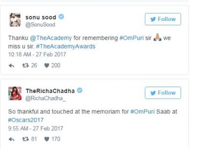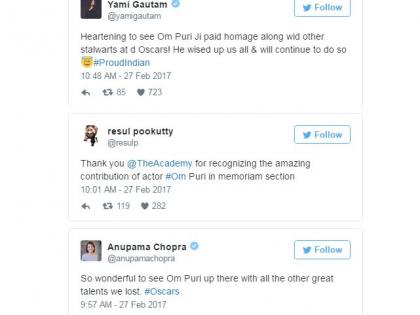 ओम पुरींना ऑस्कर सोहळ्यात कॅरी फिशर, प्रिंस, जेने वाईल्डर, मायकल किमिनो, पॅटी ड्यूक, गॅरी मार्शल, अँटन येल्चिन, मॅरी टेलर मूर, कर्टिस हॅन्सन आणि जॉन हर्ट यांच्यासोबत श्रद्धांजली वाहण्यात आली. कॅलिफोर्नियाच्या डॉल्बी थिएटरमध्ये ज्येष्ठ अभिनेते ओम पुरीना श्रद्धांजली वाहण्यात आल्यानंतर बॉलिवूडमधील कलाकरांनी सोशल मीडियावर प्रतिक्रिया दिल्या. यामध्ये यामी गौतम अनुपमा चोप्रा, सोनू सूद यांचा समावेश आहे.