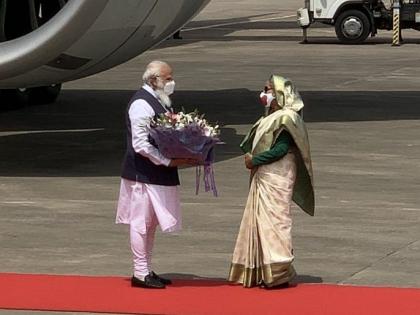 ढाका - पंतप्रधान नरेंद्र मोदी बांगलादेशमध्ये पोहोचले आहेत. ते येथे अनेक कार्यक्रमांत भाग घेणार आहेत. ढाका येथील विमान तळावर पोहोचताच बांगलादेशच्या पंतप्रधान शेख हसीना यांनी पंतप्रधान मोदींचे स्वागत केले. येथे मोदींना गार्ड ऑफ ऑनरनेही सन्मानित करण्यात आले. (PM Modi Bangladesh Visit PM Sheikh Hasina welcomes PM Narendra Modi at Dhaka airport)