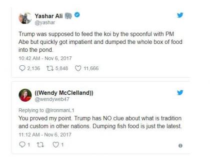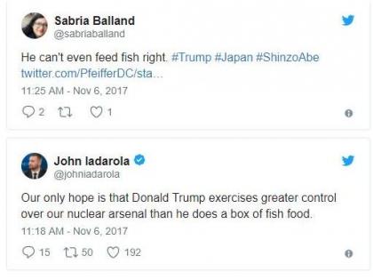 ट्रम्प यांच्याकडे माशांना खाद्य देण्याचा डबा देण्यात आला, त्यावेळी त्यांनी मागचा पुढचा विचार न करता पूर्ण डबा तलावात रिकामी केला. दुसरीकडे ट्रम्प माशांना खाद्य देण्यासाठी डबा आपल्याकडे देतील, या प्रतीक्षेत शिंजो अबे होते. या प्रकारानंतर मत्स्यजीव प्रेमींनी ट्रम्प यांच्यावर सडकून टीका केली आहे. माशांना एकदम एवढ्या मोठ्या प्रमाणात खाद्य दिलं जाऊ शकत नाही. कारण मासे एवढं खाद्य एकदम खाणार नाही. त्यांना थोड्या थोड्या वेळानं खाद्य दिलं पाहिजे, असंही अनेकांचं म्हणणं आहे.