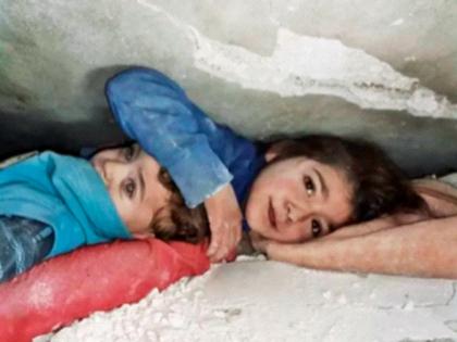 भूकंपातून आश्चर्यकारकपणे बचावल्यानंतर ढिगाऱ्याखाली ७ वर्षांची चिमुकली लहानग्या भावाच्या रक्षणासाठी त्याच्या डोक्यावर हात ठेवून मदतीची वाट बघताना...