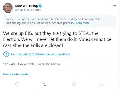 जो बायडन यांच्याशी चुरशीची लढत सुरू असतानाच राष्ट्राध्यक्ष डोनाल्ड ट्रम्प यांनी ट्विट केले होते, की "आपण फार पुढे आहोत, मात्र ते निवडणुकीत चोरी करण्याचा प्रयत्न करत आहेत. आम्ही त्यांना हे कधीही करू देणार नाही. मतदान झाल्यानंतर मत दिले जाऊ शकत नाही."
