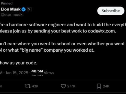 "तुम्ही हार्डकोर सॉफ्टवेअर इंजीनिअर असाल आणि ॲप तयार करण्याची इच्छा असेल, तर तुमचे सर्वोत्तम काम code@x.com वर पाठवून आमच्यात सामील व्हा. तुम्ही कोणत्या शाळेत गेलात किंवा तुम्ही शाळेत गेलात की नाही किंवा तुम्ही कोणत्या मोठ्या कंपनीत काम केले आहे, याची आम्हाला पर्वा नाही. फक्त तुमचा कोड दाखवा," अशी पोस्ट इलॉन मस्क यांनी केली आहे.