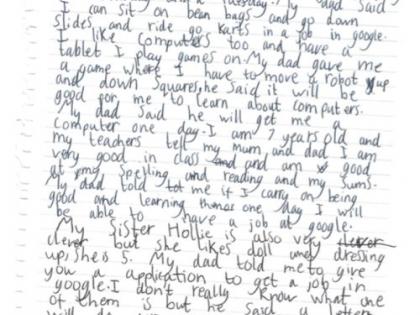 पत्रात ती म्हणते, प्रिय गुगल मालक, माझं नाव क्लो आहे आणि मी जेव्हा मोठी होईन त्यावेळी मला गुगलमध्ये काम करण्याची इच्छा आहे. मला संगणक फार आवडतात. माझ्याकडे टॅबलेट असून, मी त्याच्यावर गेम खेळते. माझे शिक्षक माझ्या आई-वडिलांना मी अभ्यासात हुशार असल्याचं सांगतात. मी बिन बॅगवर बसते आणि गुगलच्या खाली जॉब शोधत बसते. तसेच मला चॉकलेटच्या कारखान्यात काम करायलाही आवडेल, ऑलिम्पिकमध्ये जलतरणपटू होण्याची माझी इच्छा आहे. गुगलला बरेच अर्ज प्राप्त होतात. मात्र ते थेट सीईओपर्यंत ते पोहोचत नाहीत. त्यामुळेच मी थेट सीईओंना पत्र लिहिलं आहे.