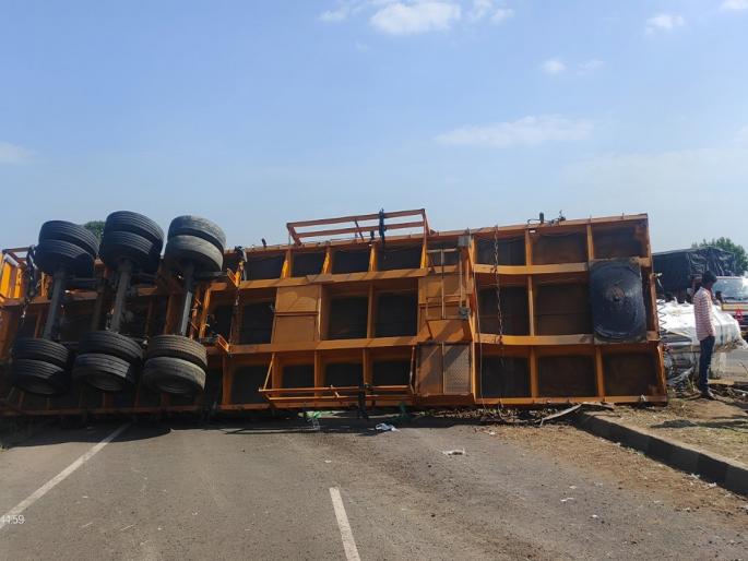 जालना : चालकाचा ताबा सुटल्याने भरधाव वेगाने जाणारा कंटेनर धुळे-सोलापूर महामार्गावरील सौंदलगाव शिवारात उलटल्याची घटना बुधवारी दुपारी एक वाजेच्या सुमारास घडली. सुदैवाने यात कुठलीही जीवितहानी झाली नाही. दरम्यान, या अपघातामुळे वाहनांच्या रांगाच रांगा लागल्या होत्या. महामार्गावरील वाहतूक तीन तास ठप्प झाली होती.
