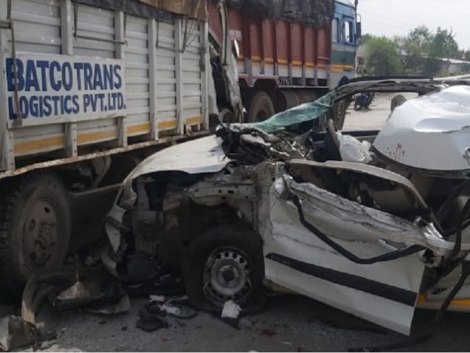 सोमवारी पहाटे दीड वाजेच्या सुमारास नाशिकहून नांदेडकडे जाणाऱ्या ट्रकचे (क्र. एम.एच १५ सी.के १५५५) जालना शहरातील अंबड चौफुलीजवळ टायर फुटले होते. त्यामुळे चालक रस्त्याच्या बाजूला टायर बदलत होता. याचवेळी औरंगाबाद येथून नांदेडकडे जाणाऱ्या आयशर ट्रक क्रमांक (एम.एच. २०.ई.एल १२६५) ने उभा असलेल्या ट्रकला पाठीमागून जोराची धडक दिली. या अपघातात ट्रकच्या समोरचा भाग पूर्ण चेंदामेंदा झाला. सुदैवाने आयशर चालक उत्तम पाटोळे हे किरकोळ जखमी झाले आहेत. त्यानंतर पहाटे पाच वाजेच्या सुमारास नाशिक येथून सिंदखेडा राजा तालुक्यातील खैरखेड्याकडे जाणारी कार क्रमांक (एम.एच.१५.टी.व्ही. १४०४) ही दोन्ही वाहनांना धडकली. या अपघातात किरण संजय धोंडगे (वय २१, रा. खैरखेडा, ता. सिंदखेड राजा) हा जागीच ठार झाला. यात विनोद आसाराम खाडे (२८), रेशमा विनोद खाडे (२६), आयुष विनोद काळे (७) किरकोळ जखमी झाले आहेत. तर आर्यन विनोद खाडे हा तीन वर्षाचा मुलगा गंभीर जखमी झाला आहे. अपघाताची माहिती मिळताच जालना पोलीस ठाण्याचे कर्मचारी दीपक दाभाडे, राजू साळवे, उमेश साबळे, गजानन काकडे यांनी घटनास्थळी धाव घेतली. महिन्याभरात घेतले चार बळीअंबड चौफुली ते मंठा चौफुली या रस्त्याचे नुकतेच चौपद्रीकरण झाले. त्यामुळे या रस्त्यावरून वाहनांची वर्दळ वाढली आहे. शिवाय, वाहनचालक अतिवेगाने वाहने चालवित असल्याने या रस्त्यावर दररोज लहान मोठे अपघात होत आहे. गेल्या महिन्याभरातच या रस्त्याने चौघांचा बळी घेतला आहे. शिवाय, रविवारी पहाटे एका खाजगी बसने जीपला धडक दिल्याची घटना घडली होती. यात एक महिला जागीच ठार झाली.