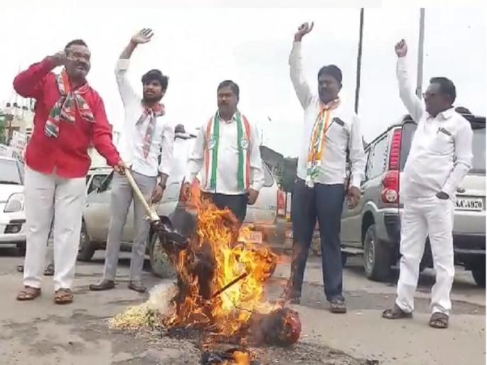 भाजपच्या जन आशीर्वाद यात्रे दरम्यान केंद्रीय राज्यमंत्री रावसाहेब दानवे यांनी राहुल गांधींना बैलाची उपमा दिली होती. अतिशय खालच्या शब्दात दानवेंनी राहुल गांधीवर टीका केली होती. त्यामुळं राज्यभरातील काँग्रेस कार्यकर्त्यांच्या भावना दुखावल्या गेल्या आहे. याचाच निषेध म्हणून जालन्यातील गांधी चमन येथे दानवेंच्या प्रतिकात्मक पुतळ्याचं दहन करण्यात आलं.
