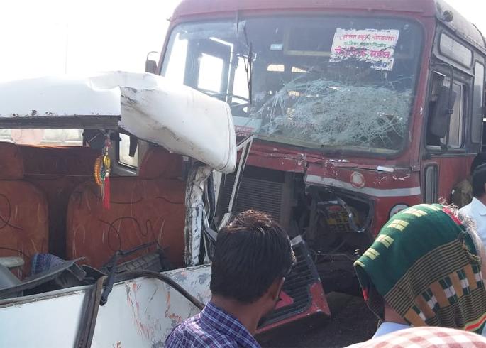 लोकमत न्यूज नेटवर्कमहाकाळा (अंकुशनगर) : येडशी - औरंगाबाद राष्ट्रीय महामार्गावर राँग साईडने जाणाऱ्या पिकअपला बसने जोरदार धडक दिल्याची घटना मंगळवारी सकाळी अंकुशनगर येथे घडली.मंगळवारी सकाळी नागझरी, शहागड, वाळकेश्वर येथील शालेय विद्यार्थ्यांना पिकअप चालक भास्कर शिंदे यांनी अंकुशनगर येथील छत्रपती शिवाजी हायस्कूलमध्ये सोडले. विद्यार्थ्यांना सोडून पिकअप राँग साईडने शहागडकडे जात होते. त्यावेळीच शहागडकडून येणाºया बीड- औरंगाबाद बस (एमएच.२०.बीएल.२८०१) ने पिकअपला (एमएच.४४.जी.०१७५) समोरून धडक दिली. या अपघातात पिकअप चालक भास्कर शिंदे (४५, रा. नागझरी, ता. गेवराई) यांच्यासह अन्य चार जण जखमी झाले आहे. जखमींवर शहागड येथील प्राथमिक आरोग्य केंद्रात उपचार करण्यात येत आहेत. यातील एक जण गंभीर जखमी असून, त्याला बीड येथील रूग्णालयात हलविण्यात आले. घटनेची माहिती मिळताच गोंदी पोलिसांनी घटनास्थळी धाव घेऊन महामार्गावरील वाहतूक सुरळीत केली. दरम्यान, बसमध्ये १० ते २० प्रवासी असल्याचे सांगण्यात आले.