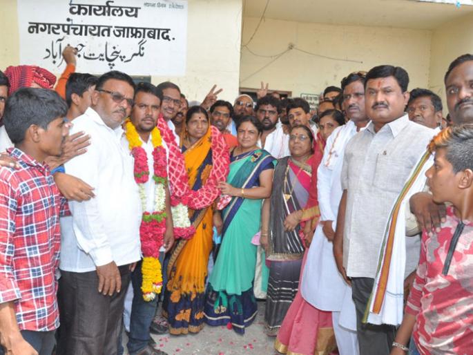 लोकमत न्यूज नेटवर्कजाफराबाद : येथील नगरपंचायतीच्या नगराध्यक्षपदी राष्ट्रवादी काँग्रेसच्या कविता दीपक वाकडे यांची तर उपनगराध्यक्षपदी अहमद शेख यांची बुधवारी बिनविरोध निवड झाली. निकालाची घोषणा होताच राष्ट्रवादी काँग्रेसच्या कार्यकर्त्यांनी फटाके वाजवून आनंदोत्सव साजरा केला. नवनिर्वाचितांचे माजी आ. चंद्रकांत दानवे, तालुकाध्यक्ष राजेश चव्हाण यांनी स्वागत केले.नगराध्यक्षपदाच्या निवडणुकी साठी पिठासीन अधिकारी हरीचंद्र गवळी यांच्या उपस्थितीत नगरपंचायत कार्यालयात सभेचे आयोजन करण्यात आले होते. तहसीलदार जे. डी. वळवी, मुख्याधिकारी विद्या कदम यांची सभागृहात उपस्थिती होती.निकाल जाहीर होताच राष्ट्रवादी काँग्रेस पक्षाच्यावतीने पत्रकार परिषद घेण्यात आली. निवडणुकी दरम्यान भारतीय जनता पार्र्टीने उमेदवारांना वेगवेगळे अमिष दाखवून पक्षात फूट पडण्याचा प्रयत्न केला. तसेच भाजपच्या नगरसेवकांनी अनेक वेळा ना हाराकत प्रमाण पत्र देऊन सुद्धा विकास कामांमध्ये अडथळे अणण्याचा प्रयत्न केला सुधाकर दानवे व माजी आ.चंद्रकांत दानवे यांनी पत्रपरिषेदेत केला. भाजप प्रदेशाध्यक्ष खा. रावसाहेब दानवे, आ. संतोष दानवे यांच्यावरही पत्रकार परिषदेत आरोप करण्यात आला. तसेच सवार्ना सोबत घेऊन जातीपातीचे राजकारण न विकासाचे विकासाचे करणार असल्याची ग्वाही या वेळी देण्यात आली.