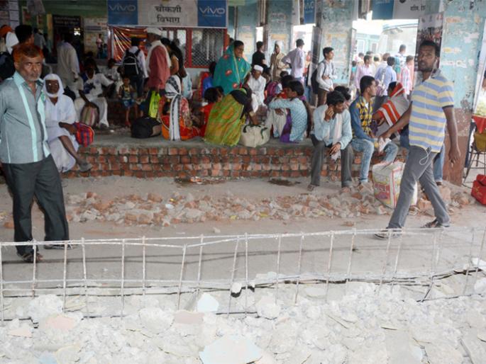 लोकमत न्यूज नेटवर्कजालना : येथील बसस्थानकाच्या नूतनीकरणाचे काम वर्षभरापासून रखडले आहे. जुनी आसन व्यवस्था तोडल्याने प्रवाशांना ताटकळत उभे राहावे लागत आहे. सर्वत्र अस्वच्छता पसरली आहे. बसस्थानकाची ही दुरवस्था जबाबदार अधिकाऱ्यांना दिसत नाही का, असा सवाल संतप्त प्रवाशांमधून केला जात आहे.जालना बसस्थानकाच्या तूतनीकरणासाठी साडेतीन कोटी रुपयांचा निधी मंजूर आहे. वर्षभरापूर्वी सुरू झालेले नूतनीकरणाचे काम सुरुवातीपासूनच संथ गतीने सुरू आहे. नूतनीकरणाच्या कामासाठी जुने बांधकाम पूर्णत: तोडण्यात आले. मात्र, त्या ठिकाणी वर्ष उलटूनही नवीन कामाला सुरुवात झालेली नाही. त्यामुळे बसस्थानकात सर्वत्र धूळ उडत आहे. बसायलाच जागा नसल्याने प्रवाशांना नाईलाजास्तव वाळूवर बसावे लागते आहे. सर्वत्र घाणीचे साम्राज्य पसरले आहे. तसेच भिंतींनाही तडे गेले आहेत. येथील रस्त्यांची चाळणी झाल्यामुळे बस आगारात आल्यावर सर्व धूळ प्रवाशांच्या अंगावर उडत आहे. योग्य सुविधा नसल्याने प्रवाशी बसस्थानक परिसरात उघड्यावरच प्रवाशी लघुशंका करत आहेत. चौकशी कक्ष नावालाच आहे. हिरकणी कक्षाला टाळे लागले आहे. तर पोलीस चौकी बेवारस आहे. रात्रीच्या वेळी स्थानकातील हायमॉस्ट बंद असतो. त्यामुळे मागील बाजूस सर्वत्र अंधार असतो. अंधाराचा फायदा घेत स्थानक परिसरात भामट्यांचा वावर वाढला आहे. बसमध्ये चढताना महिला प्रवाशांचे दागिने व पर्स चोरी जाण्याचे प्रकार वाढले आहे. तर वाहक-चालकांसाठीच्या विश्राम कक्षात अस्वच्छतेमुळे उभे राहणे कठीण होत आहे. मात्र, नाईलाजास्तव वाहक-चालकांना येथे मुक्कामी थांबावे लागत आहे. एकंदरीत बसस्थानकाचा उकिरडा होत असताना अधिका-यांचे याकडे लक्ष जात नाही का, असा प्रश्न प्रवासी विचारत आहेत.