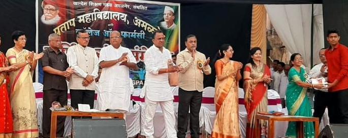अमळनेर : येथील खानदेश शिक्षण मंडळ संचलित प्रताप महाविद्यालय व कॉलेज आॅफ फार्मसी यांच्यातर्फे स्नेहसंमेलन घेण्यात आले. त्यात महाराष्ट्र तंत्र शिक्षण मंडळाकडून घेण्यात आलेल्या वार्षिक परीक्षेत यश प्राप्त केलेल्या विद्यार्थ्यांना कल्याण येथील डॉ.राखी जाधव, जळगाव जनता बँकेचे माजी अध्यक्ष संजय बिर्ला, आमदार अनिल पाटील यांच्या उपस्थितीत सन्मानित करण्यात आले.अंतिम वर्ष डी.फार्मसीत प्रथम येणाऱ्या श्वेता कलानी हिला स्व.मधुसूदन सूरजमल मुंदडे स्मृती पुरस्कार मिळाला. द्वितीय सायमा शेख हिला स्व.किरण रवींद्र बोरसे स्मृती पुरस्कार मिळाला. तृतीय हर्षदा जैन हिला स्व.अमरलाल पंजलमल अंदानी स्मृती पुरस्कार मिळाला.तसेच प्रथम वर्ष डी.फार्मसीत पहिला आलेला विद्यार्थी लोकेश दीपक पाटील यास स्व.डॉ.शिवकुमार जोशी स्मृती पुरस्कार मिळाला. द्वितीय आलेला गौरव मंधान यास अण्णासाहेब शिवाजीराव पाटील पुरस्कार मिळाला. तृतीय आलेला मयूर हिंदुजा यास जितेंद्र मोहनलाल जैन पुरस्कार देण्यात आला.याप्रसंगी खा.शि. मंडळाचे कार्याध्यक्ष प्रदीप अग्रवाल, कार्योपाध्यक्ष डॉ.संदेश गुजराथी, फार्मसी कॉलेजचे चेअरमन जितेंद्र जैन, अध्यक्ष अनिल कदम, उपाध्यक्ष माधुरी पाटील, विश्वस्त वसुंधरा लांडगे, सदस्य नीरज अग्रवाल, योगेश मुंदडे, हरी भिका वाणी, कल्याण पाटील, डॉ.बी. एस.पाटील, चिटणीस डॉ.अरुण जैन, प्राचार्य डॉ ज्योती राणे, फार्मसी कॉलेजचे प्राचार्य रवींद्र्र माळी, दोघी महाविद्यालयाचे सर्व शिक्षक व शिक्षकेतर कर्मचारी आणि सर्व विद्यार्थी उपस्थित होते.