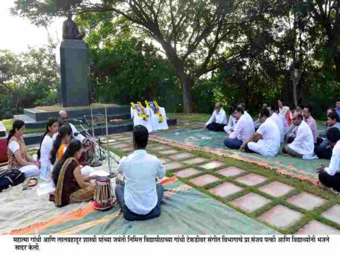जळगाव- महात्मा गांधी जयंती निमित्त कवयित्री बहिणाबाई चौधरी उत्तर महाराष्ट्र विद्यापीठात गांधी टेकडीवर सुमधूर भजन सादर करुन महात्मा गांधी यांना आदरांजली वाहण्यात आली.विद्यापीठातील विचारधारा प्रशाळे अंतर्गत असलेल्या महात्मा गांधी अभ्यास आणि संशोधन केंद्राच्यावतीने बुधवारी गांधी टेकडीवर महात्मा गांधी आणि लाल बहादूर शास्त्री जयंती निमित्त कुलगुरु प्रा. पी.पी.पाटील यांच्या उपस्थितीत कार्यक्रमाचे आयोजन करण्यात आले होते. संगीत विभाग प्रमुख प्रा.संजय पत्की यांच्या मार्गदर्शनाखाली विद्यार्थ्यांनी भजन सादर केले. यामध्ये किर्ती पंचभाई, भाग्यश्री भंगाळे, जयश्री पाटील, नंदीता बकोरे व प्रा.संजय पत्की यांनी भजन सादर केले़ तबल्यावर तेजस मराठे यांनी साथ दिली. कार्यक्रमाचे सूत्रसंचालन विभाग प्रमुख डॉ. अनिल चिकाटे यांनी केले.विद्यार्थ्यांनी काढली प्लॅस्टिक मुक्त रॅलीसमाजकार्य विभागाच्या विद्यार्थ्यांनी विद्यापीठ परिसरात हाती घेतलेल्या प्लॅस्टीक मुक्त परिसर अभियानाला कुलगुरुंच्या उपस्थितीत प्रारंभ करण्यात आला. याशिवाय केंद्रीय विद्यालय आणि विद्यापीठातील रासेयो एकक यांच्या संयुक्त विद्यमाने प्लॅस्टीक मुक्त अभियान रॅली काढण्यात आली. विद्यापीठातील या विविध कार्यक्रमास प्र-कुलगुरु प्रा.पी.पी.माहुलीकर, कुलसचिव भ.भा.पाटील, संचालक बी.पी.पाटील, अधिष्ठाता प्रा.ए.बी.चौधरी, प्र.वित्तव लेखा अधिकारी एस.आर.गोहिल, संचालक डॉ.सत्यजित साळवे, डॉ.पंकजकुमार नन्नवरे, डॉ.अनिल डोंगरे, आर.आय.पाटील, डॉ.सुनील कुलकर्णी, डॉ.पवित्रा पाटील, प्रा.संतोष खिराडे, प्रा.चिंतामण आगे, आदी उपस्थित होते.