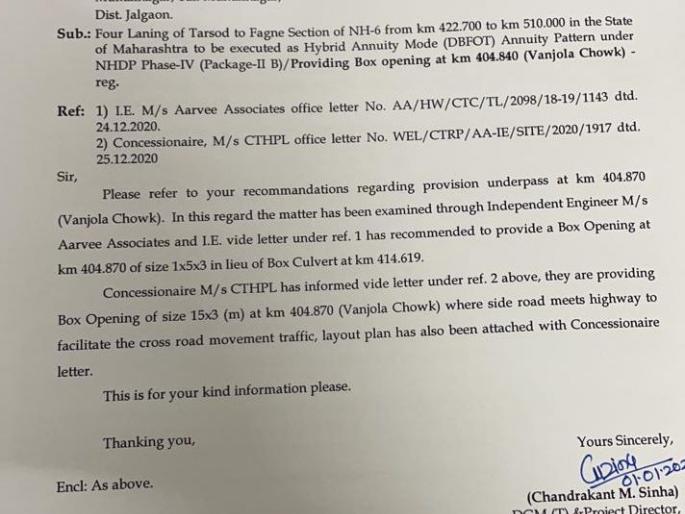 भुसावळ : शहरातील विस्तारित शहरी भागाला जोडणाऱ्या महामार्गावरील लोकसंख्या व रहदारी पाहता अंडरपास मिळावे याकरिता वेळोवेळी मागणी करण्यात आली होती. अखेर यास महामार्ग प्राधिकरणातर्फे मंजुरी मिळाल्याचे पत्र प्राप्त झाल्याने या भागातील रहिवाशांना मोठा दिलासा मिळाला आहे.नाहाटा चौफुली पुढे रेल्वे उड्डाण पुलाच्या आधी शहराच्या विस्तारित व वाढीव भाग असलेल्या सिंधी कॉलनी, श्रीराम नगर, चक्रधर नगर, दत्तनगर, चमेली नगर, बद्रीनाथ प्लॉट यासह अनेक भागांना राष्ट्रीय महामार्गापासून वांजोळा मार्गाचा वापर सोयीचे होते, मात्र महामार्ग चौपदरीकरण होत असल्याने या ठिकाणी अंडर पास न दिल्यामुळे या भागातील राहणाऱ्या नागरिकांना मोठी गैरसोय झाली होती. याबाबत माजी मंत्री एकनाथ खडसे, खासदार रक्षा खडसे, प्रा.सुनील नेवे, पुरुषोत्तम नारखेडे यांनी केंद्रीय भूपृष्ठ वाहतूक, जलसंधारण, जहाज बांधणी मंत्री नितीन गडकरी यांना प्रत्यक्ष भेटून या ज्वलंत समस्येविषयी सविस्तर माहिती दिली होती व याबाबतची शहानिशा करून अखेर महामार्ग प्राधिकरणातर्फे याठिकाणी अंडरपास मिळण्याची मंजुरी मिळाली आहे. यासाठी प्रभागातील नगरसेविका शोभा अरुण नेमाडे, महेंद्रसिंह ठाकूर, पुरुषोत्तम नारखेडे, दिनेश नेमाडे, निर्मल कोठारी, अँड.बोधराज चौधरी, रमेश नागराणी, निकी बत्रा, सोनी संतोष बारसे, प्रमोद पाटील, स्वप्नील भारंबे, नितीन इंगळे, रवी ढगे, शैलेश बराटे यांनी सातत्याने पाठपुरावा केला अखेर त्याला यश प्राप्त झाले आहे. लवकरच या ठिकाणी अंडरपास निर्मिती होणार आहे. यामुळे या प्रभागात या हद्दीतील शहरवासीयांना मोठा दिलासा मिळाला आहे.