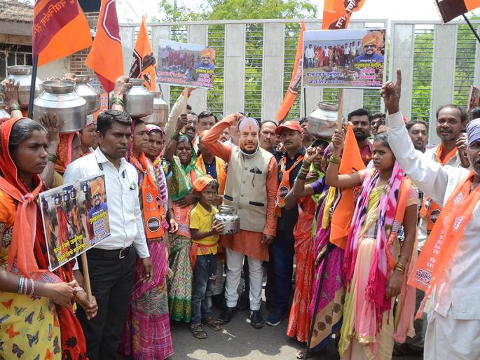 जळगाव : तालुक्यातील मन्यारखेडा येथील नागरिकांनी सोमवारी मनसेच्या नेतृत्वाखाली मुलभूत सुविधांच्या मागण्यांसाठी जिल्हाधिकारी कार्यालयावर हंडा मोर्चा काढला. यावेळी मनसेच्या पदाधिकाऱ्यांनी एका पदाधिकाऱ्याला पालकमंत्री गुलाबराव पाटील यांचा मुखवटा घालून, कपडे परिधान करून प्रतिकात्मकरित्या पालकमंत्र्यांकडे आपल्या व्यथा मांडल्या. या समस्या ऐकून गुलाबराव पाटलांनाही चांगलाच घाम फुटला होता. मनसे पदाधिकारी व मन्यारखेडा येथील रहिवाश्यांनी केलेल्या या आगळ्या-वेगळ्या आंदोलनाची चर्चा शहरात चांगलीच रंगली होती.