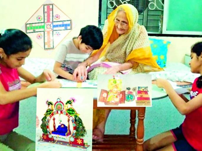 कोरोनाने अनेक बºयावाईट गोष्टी घडवल्या. दुभंगलेली माणसं मनानं जवळ आली, घराघरात बैठे खेळ होऊ लागले. एकत्र जेवण घेतलं जाऊ लागलं. शैक्षणिक संस्था बंद झाल्या तरीही आॅनलाईन क्लासेस सुरू आहेत. परीक्षा रद्द झाल्या असल्या तरीही मुलांना काहीतरी शिकवावं, त्यांनी काही नवीन शिकावं म्हणून नेहमी घरातील नातवंडं शोधणारी आजी आज त्यांच्यासोबत रमू लागलेय. नातवंडे, घरातील कर्तीसवरती माणसं आजीबार्इंना तशी सायंकाळीच भेटतात. या लॉकडाउनमुळे नातवंडांना आजीसाठी खूपच खूप वेळ आहे. आजी-नातवंडांचं नातं खूप घट्ट करणारा हा हंगाम.यंदा उन्हाळी हंगामात उन्हाळी शिबिरे होतील की नाही, हे माहीत नाही. पण काही घरांमध्ये मात्र आजी-आजोबांनी आपल्या नातवंडांना अनेक उपक्रम शिकवत जणू उन्हाळी शिबिरच घेतले आहे. लॉकडाउनमुळे कुटुंबातील सर्वांचे सध्या ‘स्टे होम’ सुरू आहे. यावेळेचा कुणी कसा सदुपयोग करेल, हे सांगता येत नाही. अशात जळगाव येथील रत्नप्रभा गांधी या आजी अनोखी कलात्मकता वापरत नातवांनी संग्रहीत केलेल्या लग्नपत्रिका व कार्डशिटपासून भेटकार्ड, भेटपाकीटं, खेळणी, देवघरातील मखर व शाळेतील प्रकल्प तयार करण्याविषयी त्या मार्गदर्शन करतात. त्यांना हा छंद लहानपणापासूनच आहे. लॉकडाउनमधे सर्वत्र दुकाने बंद असल्याने नातवांसाठी लूडोचा व चेसचा छानसा गेम त्यांनी स्वत: हातानेच तयार केला आहे. लहान मुलांना त्या आपल्या कलेविषयी मार्गदर्शन करतात. त्यांनाही विविध उपक्रम करायला शिकवतात. यामुळे मुलेही या अनोख्या उपक्रमात आजींबरोबर रमून सहभागी होत आहेत.प्लायवूडपासून तयार केलेला पाळणा स्वत: सजवला आहे. त्यांचे उल्लेखनीय कार्य म्हणजे शालवर ‘श्रीराम जयराम जय जय राम’ ही ओळ एक लाख वेळा लिहिली आहे. दिवसातील काही वेळ त्या धार्मिक पुस्तके वाचनात आणि मेडिकलमधे बसवून घालवितात. कुटुंबात रमताना लॉकडाउनमधील रिकाम्या वेळेत नवं काहीतरी करण्याचा या आजींचा ध्यास तरूणाईसमोर नक्कीच आदर्श ठरेल आणि हे सर्व धडे त्या नातवंडांनाही देतात. आज जळगावमध्ये अनेक मुलं बाहेर खेळताना दिसतात. मात्र गांधी आजींची नातवंडं आज आपल्या आजीभोवती नवनवीन काहीतरी शिकत आहेत. कोरोनामुळे नात्याच्या संध्याकाळी नव्याने पहाट झालेय, असं आता वाटू लागलंय.-विहार तेंडुलकर, जळगाव