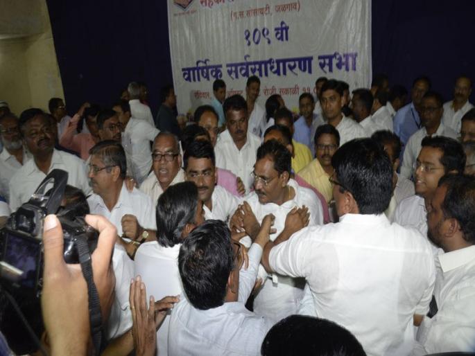 विरोधकांना बोलू द्या अशी मागणी करीत रावसाहेब पाटील तसेच अनेक सदस्य व्यासपीठावर पोहोचले. भडगाव येथील राकेश मधुकर पाटील हे सदस्य विरोधकांनाही बोलू द्या, अशी मागणी करीत व्यासपीठावर चढले. तेथे सत्ताधारी गटातील मनोज पाटील व अन्य संचालकांशी त्यांचा वाद झाला. त्यातच त्यांना सत्ताधारी संचालकांनी ढकलल्याने ते स्टेजवरून खाली कोसळले.