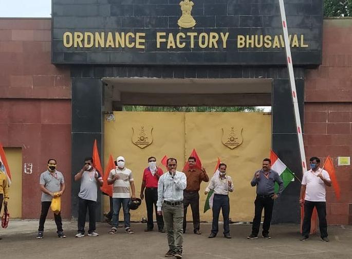 भुसावळ : येथील आॅर्डनन्स फॅक्टरीतील कामगारांनी सरकारच्या आयुध निर्माणी निगमिकरण निर्णयाविरोधात ८ रोजी देशव्यापी ‘आयुध निर्माणी बचाव दिवस’ साजरा केला व एका दिवसाचा उपवास ठेवून दुपारच्या जेवणावर बहिष्कार घातला.संयुक्त संघर्ष समितीच्या वतीने आयोजित आंदोलनात सकाळी सर्व कामगार एकत्र येत शनिवारी मुख्य गेटवर कामावर जातेवेळी सरकारविरोधी जोरदार घोषणाबाजी व प्रदर्शन करून सरकारचे लक्ष वेधण्याता प्रयत्न केला. तसेच ९ आॅगस्ट ‘भारत छोडो आंदोलन’ रविवारी सुटी असल्याने आजचे निमित्त साधून भारत बचाव दिनही साजरा करण्यात आला.सर्व कर्मचाऱ्यांनी दुपारच्या जेवणावर बहिष्कार टाकला. प्रकाश कदम, दिनेश राजगिरे यांनी मार्गदर्शन केले.स्थानिक संयुक्त संघर्ष समितीच्या वतीने किशोर पाटील, नवल भिडे, एम.एस.राऊत, किशोर चौधरी, अनिल सोनवणे, के.बी.राजपूत यांनी कार्यक्रमाचे नियोजन केले.