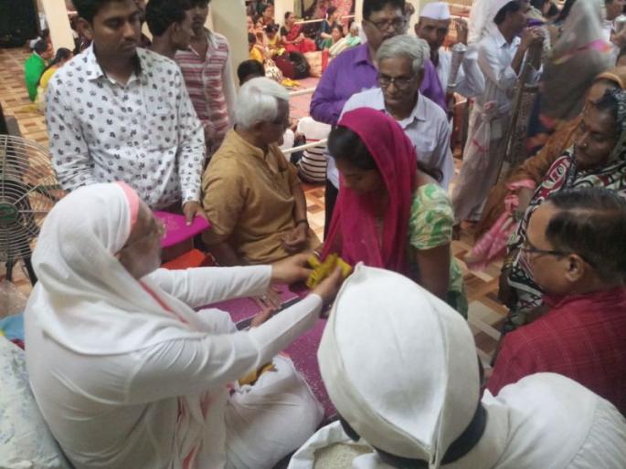 आॅनलाईन लोकमतअमळनेर,दि.३० - संत सखाराम महाराज पुण्यतिथी निमित्त २९ रोजी प्रसाद महाराजांनी १५०० महिला पुरुषांची ओटी भरण्यात आली. तर सेवेकऱ्यांना शिधा वाटप करण्यात येऊन सर्व रोग तपासणी शिबिर घेत गरजूंना मोफत औषधी वाटप करण्यात आलेपुरुषांची ही ओटी भरली जातेसर्वसाधारणपणे ओटी महिलांची भरली जाते. मात्र सखाराम महाराज पुण्यतिथी निमित्त पुरुष, महिला अथवा जोडीने ओटी भरली जाते. २९ रोजी सुमारे १५०० लोकांची प्रसाद महाराज यांच्या हस्ते ओटी भरण्यात आली. ब्लाउज पीस व तांदूळ ओटीत टाकला जातो. पुरुषांना खडी साखर दिली जाते. ओटीसाठी ४ क्विंटल तांदूळ लागला. ओटी भरली गेली तर महिलेचे सौभाग्य वाढते अशी श्रद्धा आहे.गाडीभर भात करीत केली अन्नपूर्णा पूजारात्री अन्नपूर्णा देवतेची पूजा करण्यात आली. सुमारे गाडीभर भात करून त्यावर अन्नपूर्णा देवतेचे दिवे तसेच भरड्याचे वडे ठेवून पूजा केली जाते. त्यानंतर तो भात नाभिक समाजाला देण्याची प्रथा आहे. तर वडे लोक प्रसाद म्हणून घरी नेऊन धान्यात ठेवतात. वडे धान्यात ठेवल्यास कधीच अन्न धान्य अपूर्ण पडत नाही अशी श्रद्धा आहे. सखाराम महाराज पुण्यतिथीची द्विशताब्दी असल्याने पुणे येथे २६ मे रोजी विष्णुयाग यज्ञ करण्यात येणार आहे. तर २ जून रोजी औरंगाबाद येथे ११ हजार लोक दासबोध पारायण करणार आहेत. तसेच पुढील वर्षी बोरी नदी पात्रात १०० कुंडी यज्ञ करण्यात येणार आहे.लोटांगण चक्री भजनसकाळी ९ ते ११ या दरम्यान पूजा पराग यांचा शास्त्रीय संगीताचा कार्यक्रम झाला. हभप भगवानबुवा सडगावकर, बेलापूरकर महाराज, प्रकाशबुवा , त्र्यंबकबुवा शेजवळकर, रुपचंद महाराज यांचे कीर्तन झाले. तर पारणे जि.जालना येथील गोविंद भगवानराव लोंटांगणे यांचे देवासमोर लोटांगण घालत दीड तास चक्री भजन झालेसर्व धर्मियांना शिधा वाटपवर्षभर वाडी संस्थांची व सखाराम महाराजांची यात्रेत व इतरवेळी सेवा करणाºया सुतार , लोहार, चर्मकार, पाटील, ब्राम्हण, खाटीक, कसाई, मातंग, फकीर, परीट, नाभिक, भिक्षुक अशा सर्व समाजाच्या लोकांना संस्थांतर्फे महाराजांनी तेल, मीठ, हळद, गहू तांदूळ, पीठ शिधा वाटप करण्यात आले.