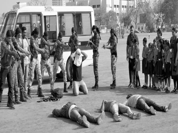 जळगाव,दि.१५ : भुसावळ येथून शाळेचे विद्यार्थी घेऊन येणाºया स्कूलचे शस्त्रधारी चार अतिरेक्यांकडून साकेगाव पुलाजवळ अपहरण होते. त्यानंतर पोलिसांनी राबविलेल्या आॅपरेशनमध्ये जळगाव शहरात महामार्गावर कालिंका माता चौकात अपघात झाल्याचे भासवून स्कूल बस थांबविण्यात येते. तेथे वाद सोडविण्यासाठी दोन अतिरेकी बसच्या खाली उतरताच अतिरेक्यांना घेरुन बस ताब्यात घेण्यात येवून विद्यार्थ्यांची सुटका करण्यात येते. या अपहरण नाट्यात तीन अतिरेक्यांचा खात्मा होता तर एकाला जीवंत पकडण्यात येते. या घटनेचे थरारक प्रात्यक्षिक गुरुवारी पोलीस दलाने केले.