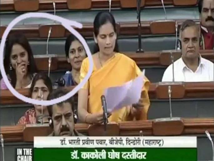 भाजपा नेत्या आणि दिंडोरी मतदारसंघाच्या नवनिर्वाचित खासदार डॉ. भारती पवार यांच्या भाषणाचा व्हिडीओ सोशल मीडियावर व्हायरल झाला आहे. नवोदित खासदार असूनही त्यांनी ज्या पद्धतीने मुद्दे मांडले, ते कौतुकास्पद आहेच; पण हे भाषण व्हायरल होण्यामागचं कारण वेगळं आहे. ते म्हणजे, भारती पवार बोलत असताना त्यांच्या मागच्या बाकांवर बसलेल्या खासदार डॉ. प्रीतम मुंडे आणि डॉ. रक्षा खडसे यांचं हसू. लोकसभेत गंभीर विषयांवर चर्चा सुरू असताना, त्यातही महाराष्ट्रातीलच एक खासदार बोलत असताना या दोघींचं हसणं नेटकऱ्यांना खटकलंय आणि त्यामुळेच त्यांच्यावर टीकाही होतेय. त्यावर, रक्षा खडसे यांनी आपली बाजू मांडण्याचा प्रयत्न केला आहे.