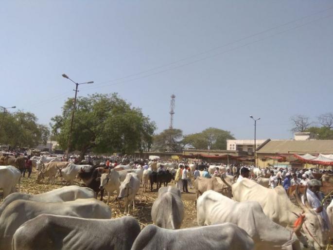 ठळक मुद्देमंदीची अवकळा चारा-पाण्याअभावी गुरे विक्रीला आणलेल्या पशुपालकांना मंदीचाही मार सहन करावा लागला. गुरे होऊन त्यांचे पोषण कसे करायचे, असा प्रश्न गुरे खरेदी करणाºयांनाही पडल्याने व्यवहार फारसे झाले नाही.गुरांचे बाजारभाव असे : बैल ५० ते ६० हजार, गायी (जर्सी) २० हजार ते ६० हजार, गायी (गावरान) पाच हजार ते २० हजार, म्हशी (खादाड) पाच हजार ते २५ हजार, म्हशी (दुभती) २५ हजार ते ८० हजारसद्य:स्थितीत ग्रामीण भागात चाराटंचाईची समस्या गंभीर आहे. परजिल्ह्यातून चारा विक्रीसाठी येत असल्याने त्याचे भाव तेजीत आहे. थेट नंदुरबार जिल्ह्यातून सुका चारा विक्रीसाठी येत असून, अडीच हजार रुपये शेकडा असे चढे दर आहे. हिरवा चाराही भाव खाऊन आहे.
