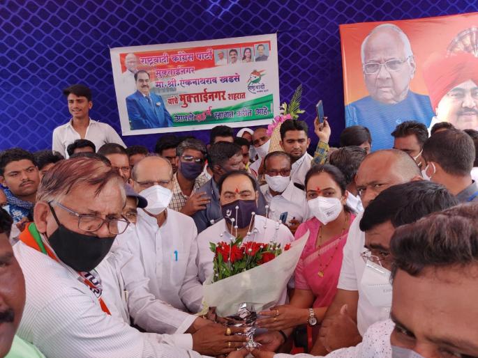 मुक्ताईनगर : अखेर भाजपातून राष्ट्रवादी काँग्रेस पक्षात सीमोल्लंघन करून माजी मंत्री एकनाथ खडसे दसऱ्याच्या दिवशी रविवारी मुक्ताईनगरला पोहोचले. राष्ट्रवादी काँग्रेस पक्ष आणि नाथाभाऊ समर्थकांनी शहरात खडसेंचे जोरदार स्वागत केले.शहरातील मुख्य प्रवर्तन चौकात तालुका राष्ट्रवादी काँग्रेस पक्षाच्या वतीने जोरदार स्वागत करण्यात आले. यावेळी राष्ट्रवादी काँग्रेसचे जिल्हाध्यक्ष रवींद्र पाटील, तालुका अध्यक्ष यु.डी.पाटील, विधानसभा क्षेत्र अध्यक्ष ईश्वर राहणे, शाहिदखान, कल्याण पाटील, पं.स.चे माजी सदस्य किशोर चौधरी, साहेबराव सिंगतकर, विजय सोनार, प्रवीण पाटील, आदींनी एकनाथ खडसे व त्यांच्या कन्या रोहिणी खडसे यांचे स्वागत केले.याप्रसंगी खडसे समर्थक कार्यकर्ते मोठ्या संख्येने उपस्थित होते. मुंबईहून अनेक कार्यकर्ते वाहनांनी खडसेंसोबतच शहरात दाखल झाले. कोथळी येथे मुक्ताई दर्शनानंतर खडसे मुक्ताईनगरात दाखल झाले.दुपारी एकच्या सुमारास खडसेंच्या गाड्यांच्या ताफ्याने प्रवेश शहरात प्रवेश करताच फटाक्यांच्या आतशबाजीने जोरदार स्वागत झाले. शहरात ठिकठिकाणी आतषबाजी करून खडसें स्वागत वेगवेळ्या पदाधिकारी व संघटनांनी केला ढोलताशे आणि राष्ट्रवादी पक्षाच्या जयजयकाराच्या घोषणा पदाधिकारी कार्यकर्ते करीत होते. तत्पूर्वी एकनाथ खडसे, रोहिणी खडसे, रवींद्र पाटील व प्रमुख पदाधिकाऱ्यांनी प्रवर्तन चौकात महामानव डॉ.बाबासाहेब आंबेडकर, छत्रपती शाहू महाराज, महात्मा ज्योतिबा फुले यांच्या पुतळ्याना पुष्पार्पण केले.