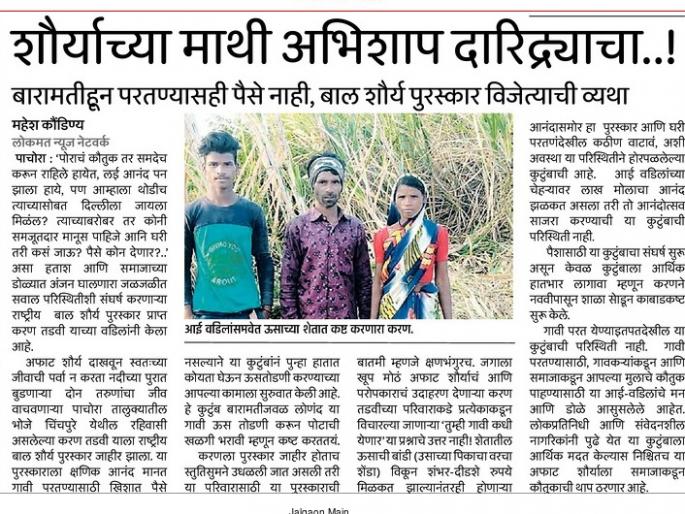 पाचोरा : देणाऱ्याचे हात हजारो, दुबळी माझी झोळी... गदिमांच्या या काव्यपंक्तीसारखीच काहीशी अवस्था राष्ट्रीय बाल शौर्य पुरस्कार विजेता करण आणि त्याच्या कुटुंबाची झाली असून त्याच्या आई-वडिलांच्या थकलेल्या डोळ्यांमध्ये आनंदाचे अश्रू आले आहेत.