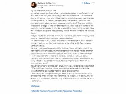 "मी तब्बल ३०-४० मिनिटं त्या ठिकाणी होते. परंतु गोवा माझ्याजवळ बिलकुल आला नाही. यामुळे मी खरंच चकित झाले, यापूर्वी असं कधीच घडलं नव्हतं," असं मेहता यांनी आपल्या पोस्टमध्ये म्हटलंय. त्यानंतर टाटांनी खुलासा करत 'गोवा' हा एक भटका श्वान आहे आणि त्याला दत्तक घेतलं असल्याचं टाटांनी सांगितल्याचंही त्यांनी नमूद केलंय.