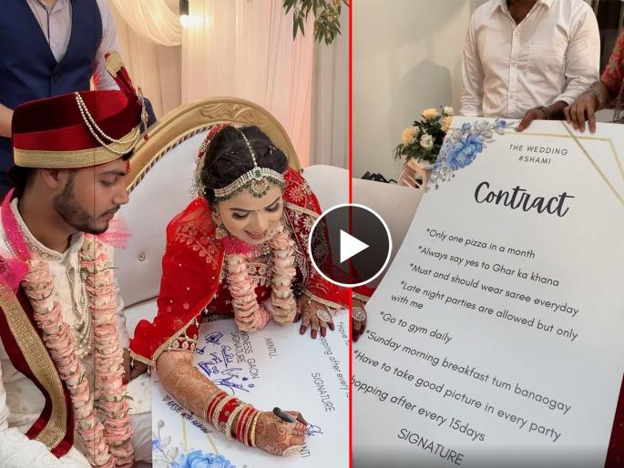 कॉन्ट्रॅक्ट पेपरवर काय लिहिले आहे ते ऐकल्यानंतर तुम्हालाही नवरीची ही स्टाईल आवडेल. यात आठ अटी आहेत. पहिली अटी म्हणजे एका महिन्यात फक्त एकच पिझ्झा खाल्ला जाईल, तर दुसऱ्या अटीमध्ये नेहमी घरच्या जेवणाला हो म्हणावे लागेल. रोज साडी नेसावी. लेट नाईट पार्टी करू शकता पण फक्त माझ्यासोबत, रोज जिमला जावे लागेल. रविवारचा नाश्ता बनवायचा आहे. प्रत्येक पार्टीत चांगला फोटो क्लिक करावा लागतो. दर 15 दिवसांनी शॉपिंगसाठी न्यावे लागेल असं म्हटलं आहे.