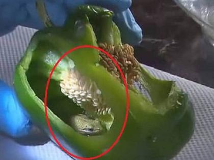 भाजी करण्यासाठी शिमला मिरची कापत असताना महिलेला बेडूक दिसला. मिरचीच्या आत मोठा जिवंत बेडूक दिसल्यानं दाम्पत्याला आश्चर्य वाटलं. डेली मेलनं याबद्दलचं वृत्त दिलं आहे. विशेष म्हणजे दाम्पत्यानं शिमला मिरची विकत घेतली, त्यावेळी एकाही मिरचीला छिद्र नव्हतं. त्यामुळे मिरचीमध्ये इतका मोठा बेडूक सापडला कसा, असा प्रश्न दोघांना पडला. दाम्पत्यानं बेडकाला बाजूला काढून एका भांड्यात ठेवलं.