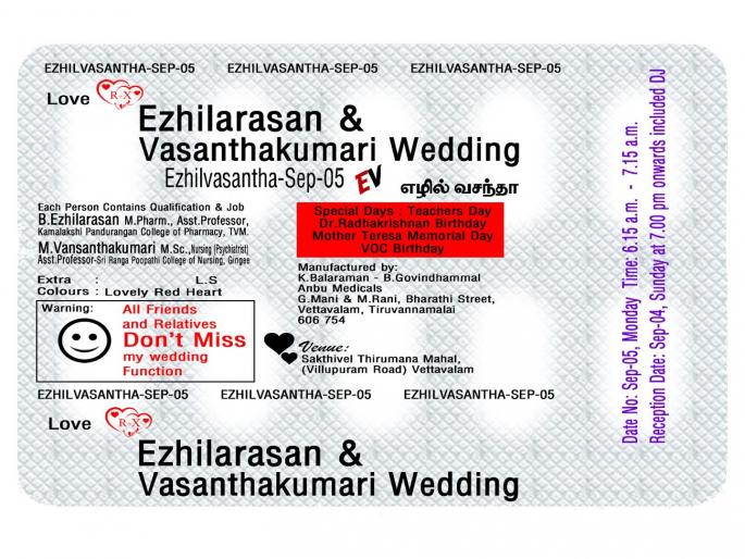 ज्यात या व्यक्तीने आपलं आणि आपल्या होणाऱ्या बायकोचं नाव, लग्नाची तारीख, स्थळ, जेवणाची वेळ आणि इतर कार्यक्रमांचाही उल्लेख केला आहे. कार्डमधील माहितीनुसार ही व्यक्त तामिळनाडूतील आहे आणि ती फार्मेसी क्षेत्राशी संबंधित आहे. जिने टॅबलेट शीटच्या रूपात आपली लग्नपत्रिका बनवली आहे.