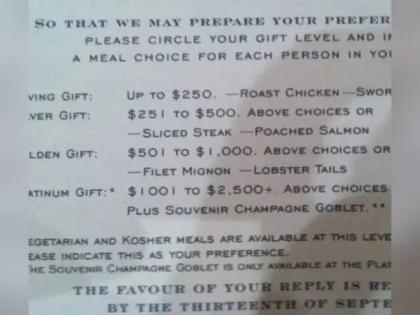 २५० डॉलरपर्यंत आहेर देणाऱ्या पाहुण्यांचा लव्हिंग विभागात समावेश करण्यात आला आहे. यात रोस्ट चिकन किंवा स्वार्डफिश मिळणार आहे. सिल्वर विभागात ५०० डॉलरपर्यंत आहेर देणाऱ्यांचा समावेश करण्यात आला आहे. तर गोल्डन विभागासाठी १ हजार डॉलरपर्यंतचा आहेर आणि प्लॅटिनम विभागातील जेवण पाहुण्यांना हवं असेल तर २५०० डॉलरपर्यंतचं गिफ्ट किंवा आहेर द्यावा लागणार आहे.
