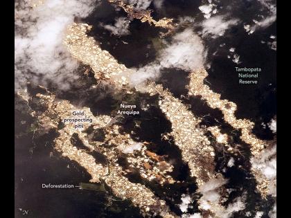 सोन्याच्या जंगलाचा हा फोटो पेरूच्या माद्रे-दे-दियोस प्रांतातील आहे. हे अॅमेझॉनच्या वर्षावनातील एक राज्य आहे. या पूर्ण परिसरात पाणी, दऱ्या, तलाव आणि नद्या आहेत. या फोटोत डावीकडे एक नदी दिसत आहे. त्याशिवाय जंगलामध्ये सोन्याच्या रंगाचे खड्डे बेकायदेशीर उत्खनन दाखवतात. यासाठी जंगलातील झाडे कापली जातात. सोन्याचं हे जंगल 15 किलोमीटर लांब आहे.