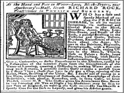 लंडनच्या ब्लॅक फ्रायर्स लेनवरच्या ॲपोथेकेरीज हॉलजवळ या रॉकचा दवाखाना होता असे या जाहिरातीवरून दिसते. “ज्याच्याकडे विविध लक्षणे असलेले ‘फ्रेंच रोग’ बरे करण्याची सुरक्षित आणि जलद पद्धत आहे’’, असा स्वतःचा उल्लेख हा रिचर्ड रॉक करतो. मग त्याने वेगवेगळ्या रोगांची आणि लक्षणांची एक भली मोठी यादीच दिलेली आहे. डोके, खांदे, हात, पाय, पाठ अशा अनेक प्रकारच्या दुखण्यावर तो इलाज करतो.