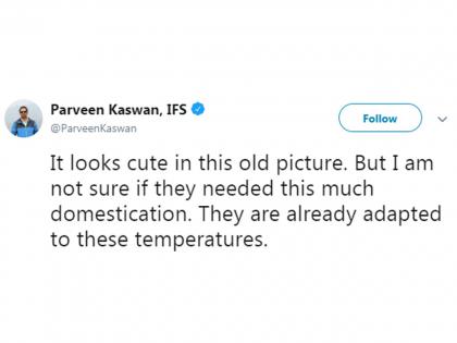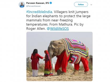 या फोटोला सोशल मिडियावर आईएफ़एस ऑफ़िसर प्रवीण कासवान यांनी शेअर केला आहे. या फोटोच हत्तीसोबत काही महिला दिसत आहेत. हा फोटो पोस्ट करत असताना -'इंक्रेडिबल इंडिया' असं कॅप्शन दिले आहे. स्वेटर सोबतच या हत्तीला एक लाल रंगाचा पायजमा सुध्दा शिवला आहे. तसंच अनेकांनी या फोटोला कूल फोटो असं संबोधलं आहे.
