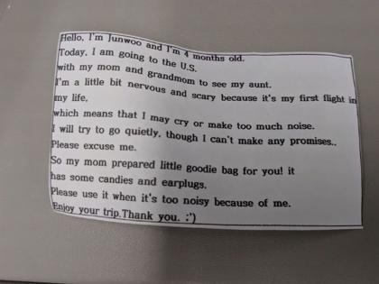 या प्लेनमध्ये २०० पेक्षा जास्त प्रवासी होते. बाळाचं नावं होतं Junwoo. त्याच्या आईने एक नोट लिहिली आणि प्रत्येक सीटवर लावली. त्यात लिहिले होते की, 'हॅलो...मी Junwoo आहे आणि मी ४ महिन्यांचा आहे. आज मी माझ्या आई आणि आज्जीसोबत मावशीला भेटायला अमेरिकेला जात आहे. मी जरा घाबरलेलो आहे, कारण हा माझा फ्लाइटने पहिलाच प्रवास आहे. त्यामुळे रडू शकतो आणि ओरडूही शकतो. मी शांत राहण्याच पूर्ण प्रयत्न करेन, पण नक्की सांगता येणार नाही. माफ करा. माझ्या आईने तुमच्यासाठी एक छोटंसं पॅकेट तयार केलं आहे. यात काही कॅंडीज आणि इअरप्लग्स आहेत. जर मी जास्त आरडाओरड केली, तर तुम्ही याचा वापर करा. प्रवासाचा आनंद घ्या. धन्यवाद!'.